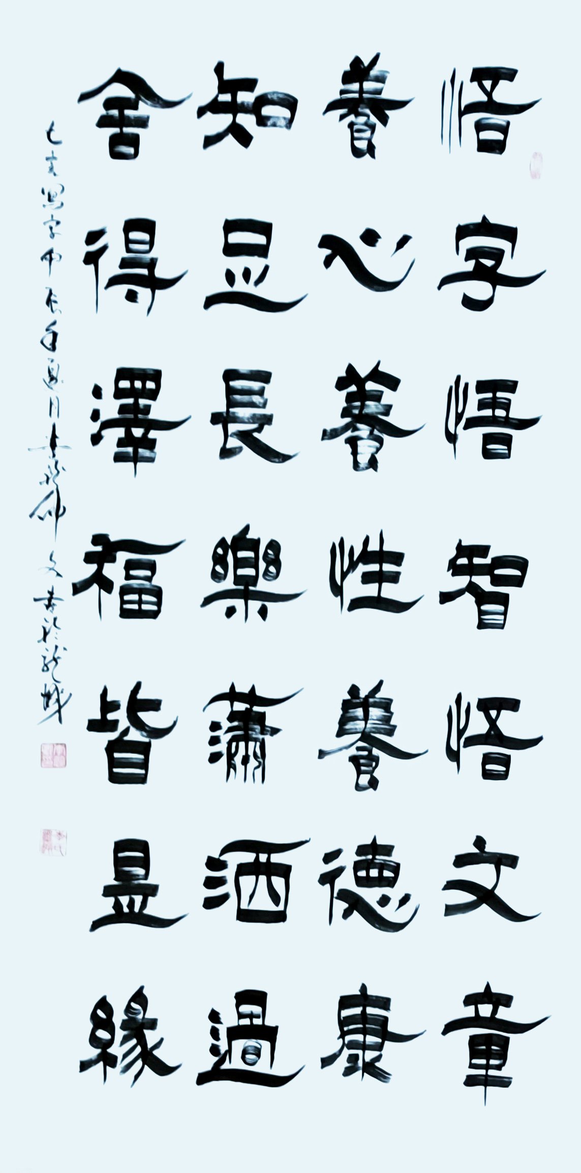 研读领悟卫夫人的"篆法圆奋,章草飘落。八分凶险,飞白逶迤"并有感悟写了七言"篆法圆润笔力健,章草飘逸潇洒行。隶书撇捺凶险至,飞白立体丝连层"四种书法理论努力照着坚持自勉做。微博名《墨趣飞白书》,百度里搜李裕卿可以見到我最新的作品。认真学研蔡邕首创的飞白书和张永明老师的篆书,认真学研大篆集字翻译了2万多作品素材字,把飞白书笔画融纳到了篆书,隶书,草书里,使飞白书这一中华民族优秀文化艺术瑰宝得到了传承发扬。